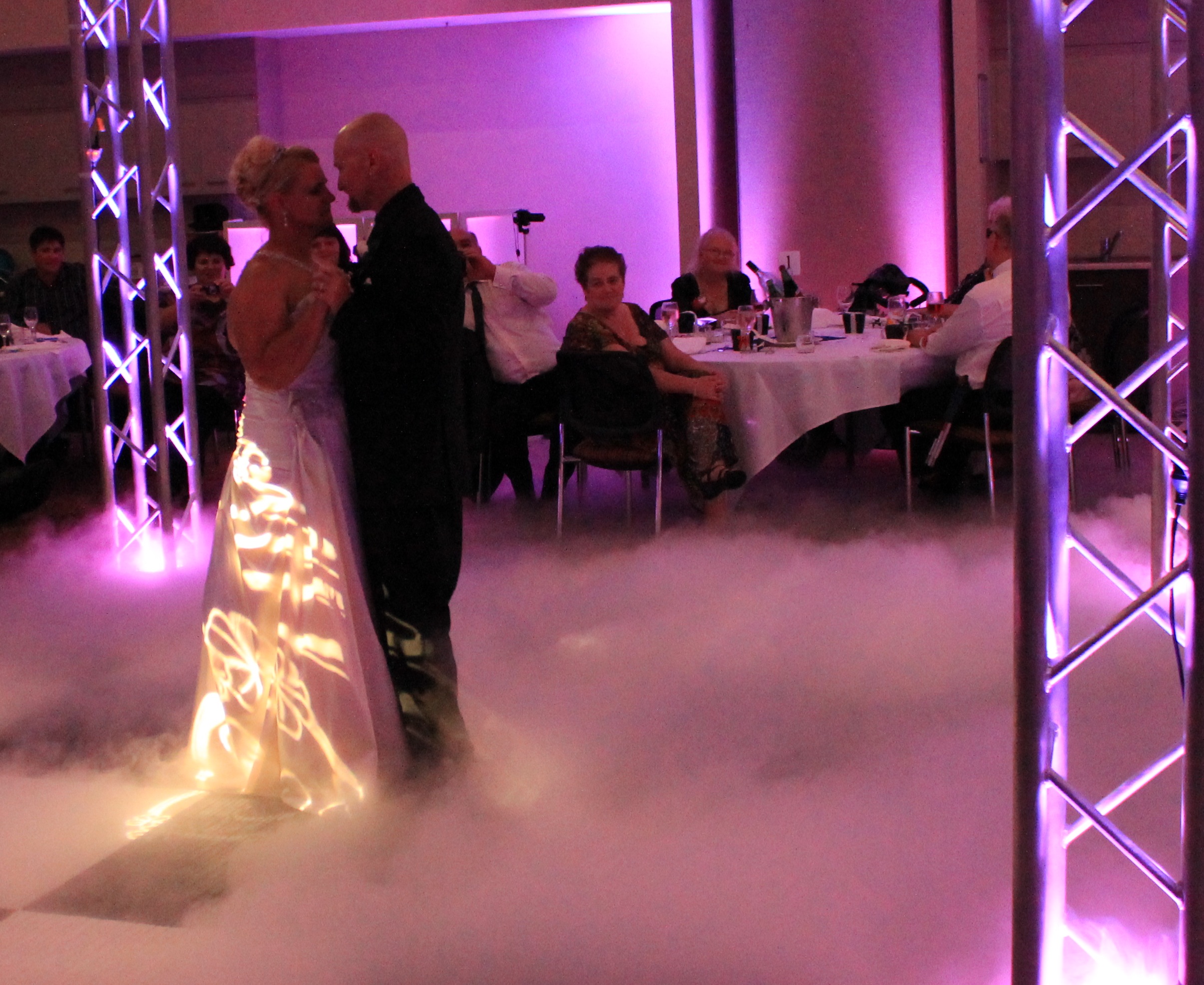 The cloud is made with a special dry ice machine that is brought out during your first dance. The cloud starts to be made as you start your first dance or father/daughter or mother/son dance. It rises no more than knee high from the floor. The white cloud is made by heating the water up and then chilling it down fast to give you the illusion that you really are on the clouds as well as making your main dances some of the best your friends and family have ever seen and will talking about for a long time. It contains no chemicals or oils, it is water based and will NOT ruin your wedding dress!